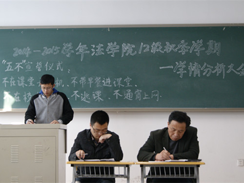 为了创建优良学风,克服老员工在生活、学习中的种种陋习,公司倡议在全院开展“五不”承诺倡议活动。本次大会上,2012级法学全体同学进行了以“不带手机进课堂,不带早餐进教室,不逃课,不校外住宿,不通宵上网”为内容的“五不”承诺宣誓活动。