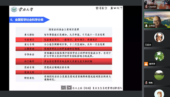 2022年1月6日下午,公司组织教师参加国家项目线上辅导。本次辅导由陕西理工大学科技处主办、陕西理工大学经济管理与法学公司等单位承办,邀请云南大学文传浩教授主讲。文教授从国家社科基金项目研究的基本素养和典型误区、国家社科基金申报表填写注意事项两个主要方面进行了细致讲解。他指出,国家社科基金项目申报要树立自信、认真研读申报公告及课题指南,坚持问题导向、突出问题意识,着力解决重大现实问题。