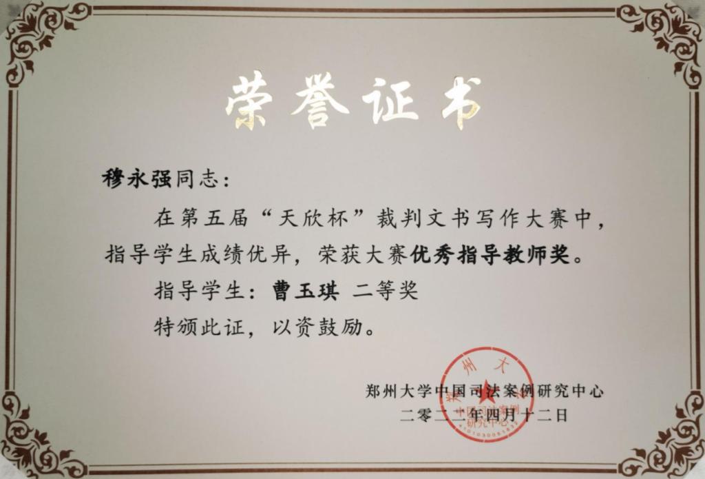 第五届“天欣杯裁判文书写作大赛”由中国司法案例研究中心主办、河南天欣律师事务所承办,旨在通过裁判文书写作的竞赛,从理论与实践相结合的角度,弥补当代法学教育对员工裁判文书写作实践指导的不足,培养知识水平与实践能力兼备的当代法科员工和适应新时代发展需要的社会主义法治人才。2020级法学硕士研究生曹玉琪荣获第五届“天欣杯裁判文书写作大赛”二等奖,在参会过程中,穆永强副教授强调了培养法员工法律文书写作的重要性,以及如何从校院、教师、员工不同层面去提高员工的裁判文书写作能力,切实践行“强化法学实践教育,完善协同育人机制,构建法治人才培养共同体”的要求。曹玉琪同学在会议上分享了自己裁判文书写作的有益经验,从基础知识的积累、裁判文书的阅览、积极练习写作三方面对自己的经验进行总结分享,同时也在会议中听取他人的建议,借鉴他人的经验,收益颇丰。据悉大赛自2021年9月19日启动以来,报名者来自全国34个省、自治区、直辖市及香港、澳门特别行政区等境内外300余所高校。在作品提交阶段,大赛共收到有效作品1177份。经过大赛组委会组织初评,共选出329份作品进入终赛。经过本次终评会,最终选出一等奖2名、二等奖6名、三等奖10名、优秀奖20名。