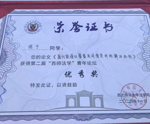 本届论坛共设置四个分会场,论坛议题涉及民商法学、诉讼法学、法律史和法学理论、宪法学与行政法学。各分论坛围绕 “敦煌法学”“简牍法学”“新时代社会治理”“人工智能法学”等法学前沿问题展开。马鑫帅、徐宁、苑汶龙、李子悦四名硕士研究生分享交流了四篇敦煌法学主题的学术论文,集中展示了公司研究生在法学理论、法律史学(敦煌法学)研究方向的最新成果。马鑫帅同学的论文获第二届“西师法学”青年论坛一等奖,徐宁同学的论文获优秀奖。