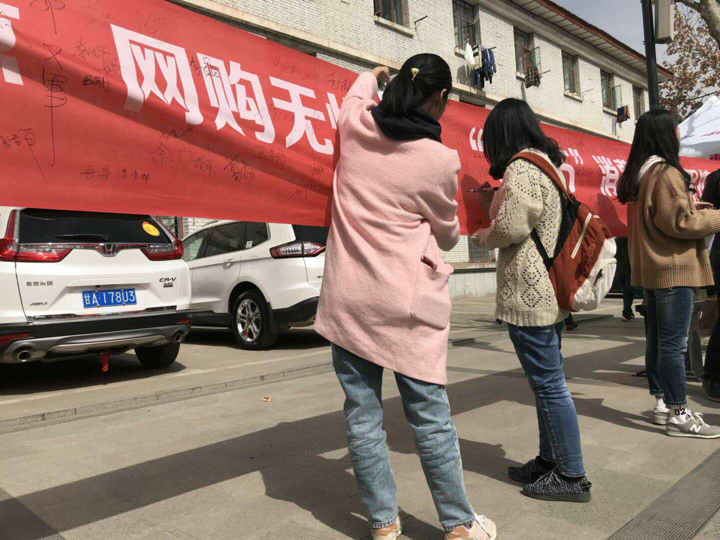 在这个特殊日子,公司研究生员工会在六号楼前挂起横幅,立起展板,举办了315普法宣传活动。不少途经的同学们和老师都在本次活动中提出了自己的疑问,在众多问题中,除了食品安全方面,大家还非常关心网络购物真假难辨、电子产品售后困难、个人信息泄漏等新问题。针对这些问题本次活动从广老员工角度出发,通过印发宣传单、现场解答问题、讲解常见消费陷阱和网络诈骗典型案例等方式,向同学们讲解了相关法律知识和维权方式,活动最后广大师生们在横幅上签下自己的名字以表明维权的决心和对本活动的支持。