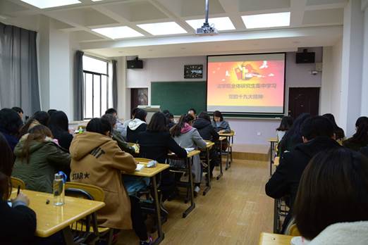 学习开始,赵学晶老师指出党的十九大,是在全面建成小康社会决胜阶段、中国特色社会主义发展关键时期召开的一次十分重要的大会,所有研究生要认真学习十九大报告全文,领会报告精神。并带领大家集中学习了习近平总书记代表第十八届中央委员会向大会做的13个部分的报告,要求大家认真做好学习笔记,并结合报告中关于“深化依法治国实践”联系专业实际,坚定理想信念,脚踏实地做出力所能及的贡献。
