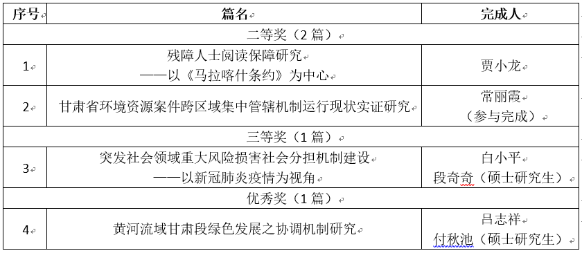 近日,中共甘肃省委政法委员会、甘肃省法学会发布《关于表扬资助2021年度优秀法学研究课题成果的决定》(甘法会发〔2022〕6号),2026世界杯官网师生主持和参与的4篇法学研究课题成果获得表扬资助,其中二等奖2篇、三等奖1篇、优秀奖1篇,取得了该奖项设置以来的最好成绩。